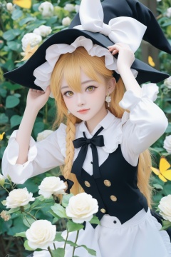 masterpiece,Realism,best quality,loli,1girl,hat,kirisame marisa,blonde hair,solo,yellow eyes,bug,witch hat,butterfly,long hair,braid,bow,flower,apron,black headwear,single braid,long sleeves,earrings,hair ornament,jewelry,white bow,hair flower,shirt,white shirt,closed mouth,hair between eyes,black bow,waist apron,white apron,hat bow,black skirt,white flower,blush,bowtie,skirt,black bowtie,looking at viewer,hair bow,rose,black vest,vest,frills,signature,buttons,hand on headwear,upper body,frilled apron,white rose,arms up,cowboy shot,yellow butterfly,arm up,hands up,artist name,side braid,ribbon,