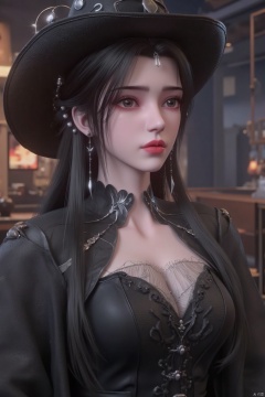 1girl, solo, long hair, breasts, looking at viewer, black hair, long sleeves, hat, dress, cleavage, jewelry, medium breasts, closed mouth, cowboy shot, earrings, indoors, wide sleeves, blurry, black dress, lips, clothing cutout, black headwear, tattoo, witch hat, blurry background, chain, red lips, bar \(place\)