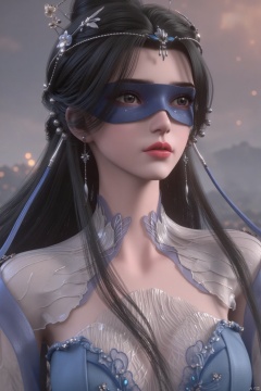 1girl, solo, long hair, black hair, hair ornament, dress, bare shoulders, jewelry, upper body, flower, earrings, blurry, blurry background, blindfold