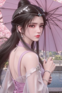 1girl, solo, long hair, breasts, looking at viewer, brown hair, hair ornament, dress, holding, bare shoulders, brown eyes, jewelry, upper body, ponytail, flower, outdoors, water, bracelet, from side, tree, umbrella, cherry blossoms, pink dress, holding umbrella, branch, bridge