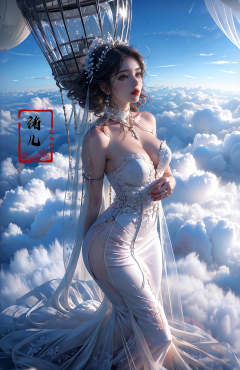 A beautiful woman with an angelic face on a hot air Huge birdcage, Huge birdcage drifts above above clouds, awed by the beauty below and, GoPro, motion blur, long exposure, full body, delicate features, high aesthetics and high art, immersed ina cinematic atmosphere, with an unreal portrait style, Paulina Washington, Chinese, realism, martial arts, Play light and shadow, Green light and shadow, Bauhaus photography, 28mm fantasy landscape, Camille Cloud, Selective focus, Panorama,(dramatic, gritty, intense:1.4),masterpiece, best quality, 32k uhd, insane details, intricate details, hyperdetailed, hyper quality, high detail, ultra detailed, Masterpiece,bridal veil,wedding dress,<lora:绪儿-热气球stage:0.8>