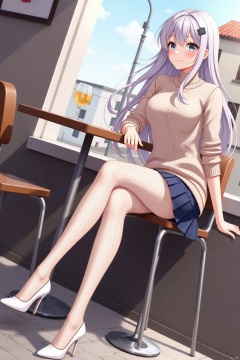 1girl,long hair,pretty,long legs,looking away,Confident and lively,sweater,Pleated skirt, white tights,white pattern pantyhose,white stiletto heels,sitting,cafe,building,city,Romantic,from below,magnificent,masterpiece, realistic, best quality, highly detailed, ,plsw,