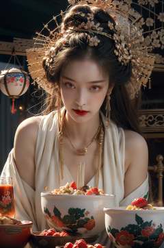 (dramatic, gritty, intense:1.4),masterpiece, best quality, 8k, insane details, intricate details, hyperdetailed, hyper quality, high detail, ultra detailed, (Dynamic Angle:1.5),(wide-angle lens,Panoramic:1.2),cyberpunk,Depth of field,(chinese style architecture),((cyberpunk city)), (light pollution), rainy night, (wet), (((cropped shoulders))), (cyberpunk), science fiction, workshop,((shiny skin)), {Extremely Delicate Beautiful},Chinese style clothes,Chinese Han clothing,White and blue Taoist robe, (colored china dress), (hybrid), messy_hair, multicolored hair, (colored tips), shiny hair,((exoskeleton)), (mechanical joints), (mechanical parts), ((internal structure)), (detailed structure), hair rings, mechanical internal structure, delicate internal structure,(cables), (wires), (pistons), electricity, (glowing orbs), (luminous engine), energy cannon, (energy core), (cables connected to body), (wire connected to body), (robotic arms), ((Electronic collar)),3d, 3d render, ray tracing,(1 group of women in qipao, eating Hot pot:1.4), heterochromia,(sitting around a round table:1.2), in a traditional noodle restaurant, (chopsticks:1.5) in hand, slurping noodles, (smiling and chatting:1.2), (red lipstick:1.1), (long hair:1.1) styled in classic Chinese fashion, (floral patterns:1.2) on their qipao dresses, brightly colored, (steaming bowls of noodles:1.4) on the table, with chopsticks and soup spoons beside them, (traditional decorations:1.1) on the walls, such as lanterns and calligraphy,(cyber screen frame:1.3),(cyberpunk Colorless goggles:1.2),1 large round table, filled with vegetables and food, (abundant variety:1.3), colorful display of fresh produce, (vibrant fruits:1.2), (leafy greens:1.1), (crisp vegetables:1.1), (juicy berries:1.2), (aromatic herbs:1.1), (grains and legumes:1.1), (assorted nuts and seeds:1.2), (delicious pastries:1.3), (mouth-watering desserts:1.2), (appetizing dishes:1.1), (platters of salads:1.2), (bowls of soups:1.1), (plates of roasted vegetables:1.2), (colorful smoothies:1.3), (glass pitchers of refreshing drinks:1.2), (utensils and cutlery:1.1) neatly arranged, creating a feast for the eyes and a celebration of healthy and flavorful cuisine, queen,<lora:绪儿-女帝queen:1>