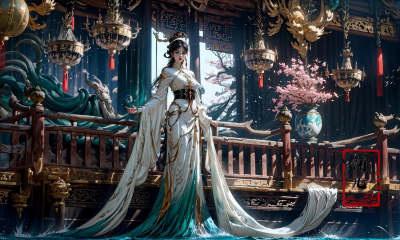 Dark and majestic Chinese palace background at night, waves and swirls of emerald color, a beautiful girl standing in the palace, the center of the sea, traditional Chinese costume jewelry,elaborate costumes, full body photos, traditional costumes, eye - catching details, the best quality,<lora:绪儿-皇宫palace background:0.9>