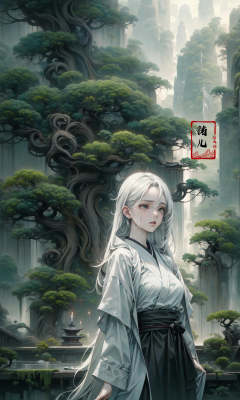 an painting in a style of oriental painting, in the style of matte painting, layered and atmospheric landscapes, rich and immersive, quiet contemplation, dark white and green, history painting, zen-inspired, grandeur of scale,highly detailed, dynamic, cinematic, stunning, realistic lighting and shading, vivid, vibrant, 8k,octane render, unreal engine, very detailed, concept art, realistic, Cry engine, wide shot,2girl,very long hair,white hair,(upper body:1.1),<lora:绪儿-松pine:0.9>