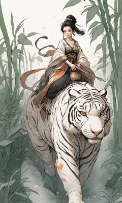 A stunning Chinese beauty in traditional Hanfu attire riding a massive tiger, carrying a large gourd,in the style of Chinese ink painting,East Asian architecture,1girl,  solo,  Bamboo hat, (white tiger:1.6),<lora:Riding a giant tiger_20230822144927:0.8>