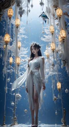 masterpiece,best quality,official art,extremelydetailed cg 8k wallpaper,Surrealism,A mature face,(realistic: 1.3) (mixed Korean),(Kpop idol), (Peacock:1.3),(Black background, night, starry sky, shooting stars across the sky:1.5),sit,Crossed legs, sitting on chair, crossed legs, (white hair:1.6),((only water)), Clear and turquoise sky, Water as smooth as a mirror, petal, There are clouds where water and sky connect, (Colorful clouds), depth of field, beautiful detailed sky,Cyan sky, beautiful detailed cloud, beautiful detailed water, reflection pool, dynamic angle, floating, finely detail, (bloom), (shine), glinting stars, feather,nature,(sunlight), fairyland,(1girl, solo:1.5),(Eye contact:1.2),(white hair:1.1),( absurdly long hair:1.5), hair accessories, (full body:1.7), (Slim body:1.1),(long legs:1.3),Blue and white Hanfu with flowing sleeves,necklace,Chinese style clothes,Chinese Han clothing,(flying petals),upper body,arms behind back,(detailed ice),crystalstexture skin,cold expression,white hair,long hair,messy hair,blue eye, looking at viewer, extremely delicate and beautiful,water,((beauty detailed eye)),highly detailed,cinematic lighting,((beautiful face)), fine water surface,(original figure painting),ultra-detailed,incredibly detailed,(an extremely delicate and beautiful), beautiful detailed eyes.Background: Chinese architecture flower and bird Tower beautiful lake,(best quality) miniature bonsai,A shot with tension,(Visual impact,giving the poster a dynamic and visually striking appearance:1.2),Chinese Zen style,impactful picture, <lora:绪儿-奇幻背景:0.8>