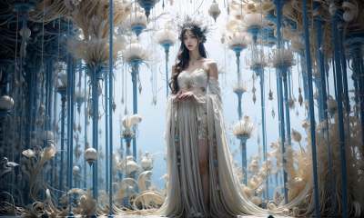 masterpiece,best quality,official art,extremelydetailed cg 8k wallpaper,Surrealism,A mature face,(realistic: 1.3) (mixed Korean),(Kpop idol), (Peacock:1.3),(Black background, night, starry sky, shooting stars across the sky:1.5),sit,Crossed legs, sitting on chair, crossed legs, (white hair:1.6),((only water)), Clear and turquoise sky, Water as smooth as a mirror, petal, There are clouds where water and sky connect, (Colorful clouds), depth of field, beautiful detailed sky,Cyan sky, beautiful detailed cloud, beautiful detailed water, reflection pool, dynamic angle, floating, finely detail, (bloom), (shine), glinting stars, feather,nature,(sunlight), fairyland,(1girl, solo:1.5),(Eye contact:1.2),(white hair:1.1),( absurdly long hair:1.5), hair accessories, (full body:1.7), (Slim body:1.1),(long legs:1.3),Blue and white Hanfu with flowing sleeves,necklace,Chinese style clothes,Chinese Han clothing,(flying petals),upper body,arms behind back,(detailed ice),crystalstexture skin,cold expression,white hair,long hair,messy hair,blue eye, looking at viewer, extremely delicate and beautiful,water,((beauty detailed eye)),highly detailed,cinematic lighting,((beautiful face)), fine water surface,(original figure painting),ultra-detailed,incredibly detailed,(an extremely delicate and beautiful), beautiful detailed eyes.Background: Chinese architecture flower and bird Tower beautiful lake,(best quality) miniature bonsai,A shot with tension,(Visual impact,giving the poster a dynamic and visually striking appearance:1.2),Chinese Zen style,impactful picture, <lora:绪儿-奇幻背景:0.8>