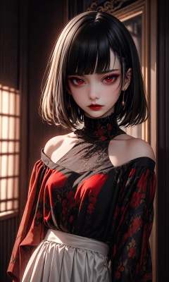 masterpiece, best quality, 32k, insane details, intricate details,1girl, fashion photography, in style of angura kei,hime - cut, straight hair,in a minimalist Misasakan room,high-wistskirt,cllaredshirt,(short hair:1.4),striped,blunt bangs,sideways glance, (cold attitude,eyeshadow,eyeliner:1.1),(red lips:1.5), (Mole under eye:1.0),hand in pocket,flower,<lora:绪儿-公主切hime cut:0.8>