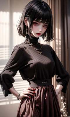 masterpiece, best quality, 32k, insane details, intricate details,1girl, fashion photography, in style of angura kei,hime - cut, straight hair,in a minimalist Misasakan room,high-wistskirt,cllaredshirt,(short hair:1.4),striped,blunt bangs,sideways glance, (cold attitude,eyeshadow,eyeliner:1.1),(red lips:1.5), (Mole under eye:1.0),hand in pocket,flower,<lora:绪儿-公主切hime cut:0.8>