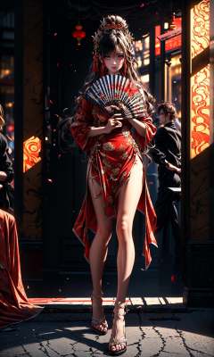 (Masterpiece),(best quality),((masterpiece)),(highres), (original:1.8), (extremely detailed 8K wallpaper), overexposure,1girl, close-up, (fan:1.1),A huge fan, exposed shoulders,(red cheongsam:1.2),(full body:1.5), <lora:绪儿-扇子fan:1>