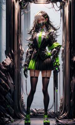 (dramatic, gritty, intense:1.4),masterpiece, best quality, 8k, insane details, intricate details, hyperdetailed, hyper quality, high detail, ultra detailed, Masterpiece,(full body:1.5),(long legs:1.4),1girl,solo,multicolored hair,two-tone hair,colored inner hair,mole under eye,suit,closed mouth,Fluorescent green,hair ornament,earrings,jewelry,miniskirt,thighhighs,green necktie,mechanical arms,single mechanical arm,headphones,headphones around neck,green eyes,mask,respirator,cyberpunk,weapon,mole,science fiction,<lora:绪儿-荧光机娘Fluorescent green:1>