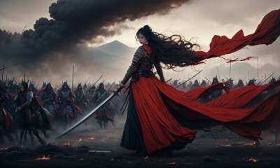 (dramatic, gritty, intense:1.4),masterpiece, best quality, 8k, insane details, intricate details, hyperdetailed, hyper quality, high detail, ultra detailed, Masterpiece, (depth of field:1.7),slow-motion action sequences, (upper body:1.5),bestquality,highdefinition,huadan,bestquality,masterpiece,highres, pixiv, emma,Chinese style costume, woman wielding a long sword, valiant Hua Mulan, ancient costume, battlefield in ancient China, surreal details, charging forward,This full body shot for Vogue, captured by Andreas Gursky, melds tradition and modernity,(light anger:1.4),( absurdly long hair:1.5),((The girl looked disgusted)), (The girl was draped in a black cloak), ((((Flames burned behind the maiden)))), (There is battlefield behind the girl), (((Bloody))),(long legs:1.3),(chinese armor:1.7),(chinese breastplate,chinese armor,:1.5),(very long skirt:1.8),(very long red cape:1.5),(sword in hand:1.5),drawing a Long, super long katana,holding one Long, super long katana,A shot with tension,(sky glows red,Visual impact,giving the poster a dynamic and visually striking appearance:1.2),Chinese Zen style,impactful picture, <lora:绪儿-焚心以火:0.8>