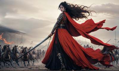 (dramatic, gritty, intense:1.4),masterpiece, best quality, 8k, insane details, intricate details, hyperdetailed, hyper quality, high detail, ultra detailed, Masterpiece, (depth of field:1.7),slow-motion action sequences, (upper body:1.5),bestquality,highdefinition,huadan,bestquality,masterpiece,highres, pixiv, emma,Chinese style costume, woman wielding a long sword, valiant Hua Mulan, ancient costume, battlefield in ancient China, surreal details, charging forward,This full body shot for Vogue, captured by Andreas Gursky, melds tradition and modernity,(light anger:1.4),( absurdly long hair:1.5),((The girl looked disgusted)), (The girl was draped in a black cloak), ((((Flames burned behind the maiden)))), (There is battlefield behind the girl), (((Bloody))),(long legs:1.3),(chinese armor:1.7),(chinese breastplate,chinese armor,:1.5),(very long skirt:1.8),(very long red cape:1.5),(sword in hand:1.5),drawing a Long, super long katana,holding one Long, super long katana,A shot with tension,(sky glows red,Visual impact,giving the poster a dynamic and visually striking appearance:1.2),Chinese Zen style,impactful picture, <lora:绪儿-焚心以火:1>