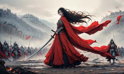 (dramatic, gritty, intense:1.4),masterpiece, best quality, 8k, insane details, intricate details, hyperdetailed, hyper quality, high detail, ultra detailed, Masterpiece, (depth of field:1.7),slow-motion action sequences,Smoke,bestquality,highdefinition,huadan,bestquality,masterpiece,highres, pixiv, emma,Chinese style costume, woman wielding a long sword, valiant Hua Mulan, ancient costume, battlefield in ancient China, surreal details, charging forward,This full body shot for Vogue, captured by Andreas Gursky, melds tradition and modernity,(light anger:1.4),( absurdly long hair:1.5),((The girl looked disgusted)), (The girl was draped in a black cloak), ((((Flames burned behind the maiden)))), (There is battlefield behind the girl), (((Bloody))),(long legs:1.3),(chinese armor:1.7),(chinese breastplate,chinese armor,:1.5),(very long skirt:1.8),(very long red cape:1.5),(sword in hand:1.5),drawing a Long, super long katana,holding one Long, super long katana,A shot with tension,(sky glows red,Visual impact,giving the poster a dynamic and visually striking appearance:1.2),Chinese Zen style,impactful picture, <lora:绪儿-焚心以火:1>