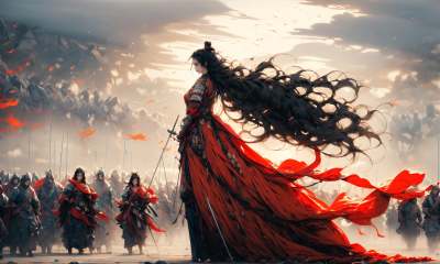 (dramatic, gritty, intense:1.4),masterpiece, best quality, 8k, insane details, intricate details, hyperdetailed, hyper quality, high detail, ultra detailed, Masterpiece, (depth of field:1.7),slow-motion action sequences,Smoke,bestquality,highdefinition,huadan,bestquality,masterpiece,highres, pixiv, emma,Chinese style costume, woman wielding a long sword, valiant Hua Mulan, ancient costume, battlefield in ancient China, surreal details, charging forward,This full body shot for Vogue, captured by Andreas Gursky, melds tradition and modernity,(light anger:1.4), (profile:1.4),( absurdly long hair:1.5),((The girl looked disgusted)), (The girl was draped in a black cloak), ((((Flames burned behind the maiden)))), (There is battlefield behind the girl), (((Bloody))),(long legs:1.3),(chinese armor:1.7),(chinese breastplate,chinese armor,:1.5),(very long skirt:1.8),(very long red cape:1.5),(sword in hand:1.5),drawing a Long, super long katana,holding one Long, super long katana,A shot with tension,(sky glows red,Visual impact,giving the poster a dynamic and visually striking appearance:1.2),Chinese Zen style,impactful picture, <lora:绪儿-焚心以火:1>