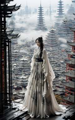 (dramatic, gritty, intense:1.4),masterpiece, best quality, 8k, insane details, intricate details, hyperdetailed, hyper quality, high detail, ultra detailed, Masterpiece, elaborate Hanfu,(Hanfu,Chinese architecture:1.3), stands amidst a bustling metropolis' futuristic architecture. This full body shot for Vogue, captured by Andreas Gursky, melds tradition and modernity, <lora:elaborate Hanfu_20230808075428:1>