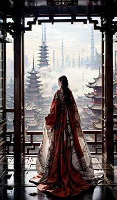 (dramatic, gritty, intense:1.4),masterpiece, best quality, 32k, insane details, intricate details, hyperdetailed, hyper quality, high detail, ultra detailed, Masterpiece, elaborate Hanfu,(red Hanfu:1.4),(Chinese architecture:1.5),red,1 girls, smoke,fog,A high fashion model, in an elaborate Hanfu designed by Alexander McQueen, stands amidst a bustling metropolis' futuristic architecture. This full body shot for Vogue, captured by Andreas Gursky, melds tradition and modernity,<lora:绪儿-﷿定汉服:0.9>