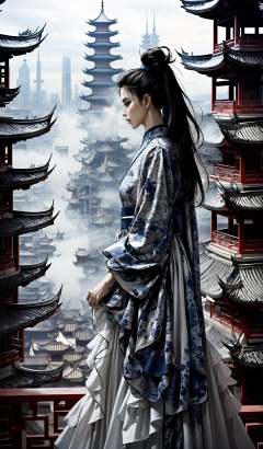 (dramatic, gritty, intense:1.4),masterpiece, best quality, 32k, insane details, intricate details, hyperdetailed, hyper quality, high detail, ultra detailed, Masterpiece, elaborate Hanfu,(blue Hanfu:1.4),(Chinese architecture:1.5),blue, (profile:1.4), upper body,1 girls, smoke,fog,A high fashion model, in an elaborate Hanfu designed by Alexander McQueen, stands amidst a bustling metropolis' futuristic architecture. This full body shot for Vogue, captured by Andreas Gursky, melds tradition and modernity,<lora:绪儿-﷿定汉服:0.9>