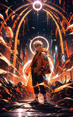 Naruto Uzumaki in Naruto, holographic reality, holographic halo, motion blur, game light effect, rim light, soft light, movie rim light, delicate light, cyberpunk style, oil painting texture, full length shot, 3D artist, detailed, futuristic, <lora:Naruto_20230804071043-000014:0.8>