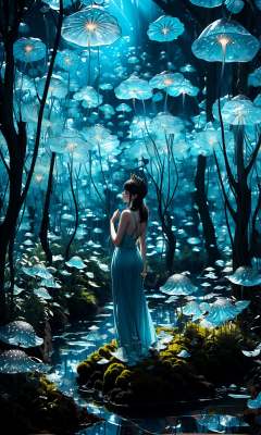 wide shot, blurry background, bokeh,dark, night, depth ffield,(aqua theme:1.3),1girl, solo,from behind, facing away,fantasy, water drop,At the seashore, the horizon where water meets the sky, 1 girl, tranquil, cosplay, Mermaid Princess, sitting on a rock, cascading waves, flowing hair, shimmering scales, adorned with seashells, mesmerizing gaze, turquoise eyes, subtle makeup, curvaceous figure, wearing a pearl-studded tiara, flowing sea-blue gown, barefoot in the sand, gentle breeze, seagulls forest, bare tree, silhouette, soaring above, golden sunlight, peaceful atmosphere, glowing,flower,holding, outdoors, scenery, reflection, water, ripples, light particles, <lora:绪儿-梦幻森林:1>