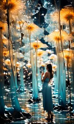 wide shot, blurry background, bokeh,dark, night, depth ffield,(yellow theme:1.3),1girl, solo,from behind, facing away,fantasy, water drop,At the seashore, the horizon where water meets the sky, 1 girl, tranquil, cosplay, Mermaid Princess, sitting on a rock, cascading waves, flowing hair, shimmering scales, adorned with seashells, mesmerizing gaze, turquoise eyes, subtle makeup, curvaceous figure, wearing a pearl-studded tiara, flowing sea-blue gown, barefoot in the sand, gentle breeze, seagulls soaring above, golden sunlight, peaceful atmosphere,glowing,flower,holding, outdoors, scenery,reflection, water, ripples, light particles,forest, bare tree, silhouette,<lora:绪儿-梦幻森林:1>