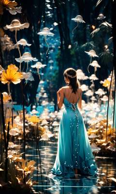 wide shot, blurry background, bokeh,dark, night, depth ffield,(yellow theme:1.3),1girl, solo,from behind, facing away,fantasy, water drop,At the seashore, the horizon where water meets the sky, 1 girl, tranquil, cosplay, Mermaid Princess, sitting on a rock, cascading waves, flowing hair, shimmering scales, adorned with seashells, mesmerizing gaze, turquoise eyes, subtle makeup, curvaceous figure, wearing a pearl-studded tiara, flowing sea-blue gown, barefoot in the sand, gentle breeze, seagulls soaring above, golden sunlight, peaceful atmosphere,glowing,flower,holding, outdoors, scenery,reflection, water, ripples, light particles,forest, bare tree, silhouette,<lora:绪儿-梦幻森林:0.8>