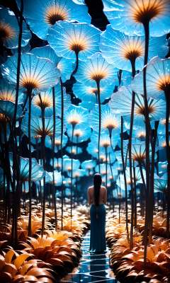 wide shot, blurry background, bokeh,dark, night, depth ffield,(blue theme:1.3),1girl, solo,from behind, facing away,fantasy, water drop,At the seashore, the horizon where water meets the sky, 1 girl, tranquil, cosplay, Mermaid Princess, sitting on a rock, cascading waves, flowing hair, shimmering scales, adorned with seashells, mesmerizing gaze, turquoise eyes, subtle makeup, curvaceous figure, wearing a pearl-studded tiara, flowing sea-blue gown, barefoot in the sand, gentle breeze, seagulls soaring above, golden sunlight, peaceful atmosphere,glowing,flower,holding, outdoors, scenery,reflection, water, ripples, light particles,forest, bare tree, silhouette,<lora:绪儿-梦幻森林:0.95>