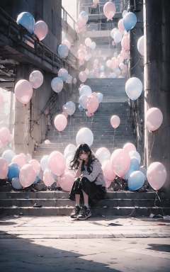 (dramatic, gritty, intense:1.4),masterpiece, best quality, 8k, insane details, intricate details, hyperdetailed, hyper quality, high detail, ultra detailed, Masterpiece, light and shade contrast,The girl Sitting formation of balloons on,the ground, the ground, the style of the Kawaguchi icerink, cheerfulrunning movements, light pinkand black, surreal urban scenes, kenro izu,traditional portrait painting, unified stageimages, zeiss milvus 25mmf/1.4ze  <lora:balloon_20230803194309:1>