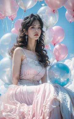 (dramatic, gritty, intense:1.4),masterpiece, best quality, 8k, insane details, intricate details, hyperdetailed, hyper quality, high detail, ultra detailed, Masterpiece, light and shade contrast,full-body image, A beautiful maiden, in a fairy dress, sat on a pale blue ball against a background of three transparent pink balloons, Hair rings, blue sky and white clouds,light pinkand black, surreal urban scenes, kenro izu,traditional portrait painting, unified stageimages,
