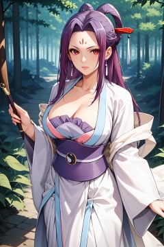 1girl,solo,red eyes, forehead mark, long hair, purple hair, earrings, hanfu,wide sleeves,hair stick,shawl