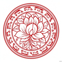 An eye-level drawing of a circular, intricate design in a stark white background. The design features a white flower in the center of the frame, flanked by two smaller flowers on either side. The flowers are outlined in a vibrant red, adding a pop of color to the otherwise monochromatic design. The border of the design is made up of a series of interlocking lines, creating a intricate pattern. The background is a solid white, providing a stark contrast to the design.