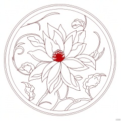 An eye-level drawing of a white flower with a red center. The flower is in the center of the image and is surrounded by a circular design of leaves and branches. The background is a solid white color.An eye-level view design,Traditional Chinese Pattern Design