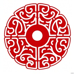An eye-level view of a red and white circular design on a white background. The design features a circular white circle in the center of the design. The circle is surrounded by a series of red swirls. The swirls are outlined in white, creating a intricate pattern. The background is a solid white, adding a pop of color to the image.
