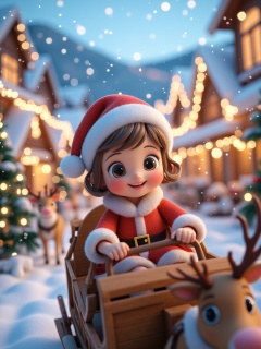 miluo_sdj, Photograph of a CGI Christmas scene featuring a cute, smiling, young girl with light brown hair in a Santa hat, driving a wooden sleigh pulled by reindeer. She's surrounded by festive houses, snow-covered trees, and twinkling lights. The background is a charming, snowy village bathed in warm, festive glow.<lora:miluo丨圣诞场景-卡通世界-flux-1.3:1>