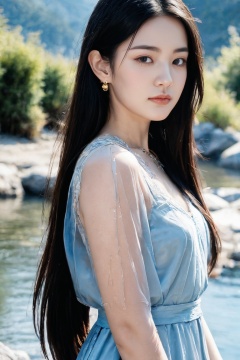 1girl, solo, portrait, young, long hair, dress, blue dress, jewelry, earrings, outdoors, black hair, mountain, see-through, water, hair ornament,