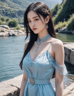 1girl, solo, upper body, young, long hair, dress, blue dress, jewelry, earrings, outdoors, black hair, mountain, see-through, water, hair ornament,
