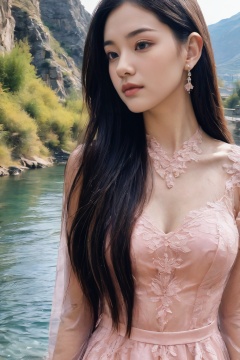 1girl, solo, portrait, young, long hair, dress, pink dress, jewelry, earrings, outdoors, black hair, mountain, see-through, water, hair ornament,