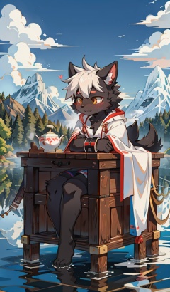 score_9, score_8_up, score_7_up, score_6_up, score_5_up, score_4_up, score_9, cute furry full body, chinese ink paint style, black fur, white eyes, drooping ears, white robe, black cuff, black ribbon, glimmering eyes, relaxed , smelling tea, mountains and rivers, boat, clouds, foggy, shota,black skin