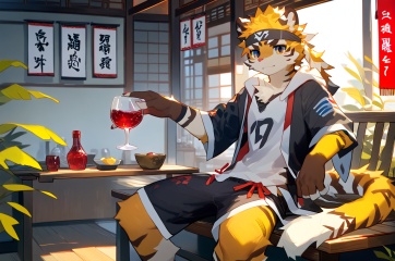 score_9_up,score_8_up,score_7_up,score_6_up,score_5_up,BREAK,(by Sakehabera:0.9),(by Shiroyichuan:0.9),by 18plusplus,(by taetae:0.9),(by fdj 1997:0.8),(by imato:0.9)BREAK,æ§å¤©è£´,manthro,tiger,solo,male,felid,black clothes,tied hair,headband,brown hair,striped fur,striped body,yellow tur,Chinese wine glass,fur,countershading,beverage,holding object,stripes,clothed,sitting,orange fur,white body,aged up,looking at viewer,full body,body fur,anthro,furry,