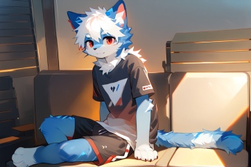 solo,male_focus,furry, (white_hair,red_eyes),(blue fur,cat_ears), body_fur,white_fur,t-shirt,shorts, BREAK, portrait,sitting,on_side, (masterpiece, best quality:1.1),body fur,