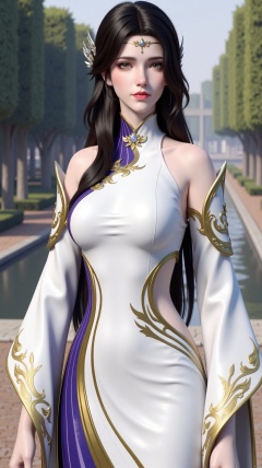 The image is a digital illustration of a young woman with long dark hair and a crown on her head. She is standing in a park-like setting with trees and a fountain in the background. The woman is wearing a long, flowing white dress with gold accents and a purple skirt. The dress has a high neckline and long sleeves, and the skirt is cinched at the waist with a gold belt. She has a pair of gold earrings on her left ear and a gold necklace on her right ear. Her hair is styled in loose waves and she is looking off to the side with a serious expression on her face. The overall mood of the image is elegant and regal.