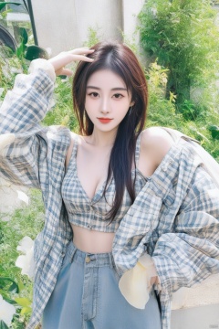 1girl,Checkered shirt, shorts,half body,The unbuttoned button
