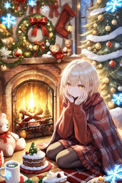 christmas,transparent,Torino,Goth_scenario,Melting,lightshadow,blonde anime girl,green red plaid blanket,Christmas cake,yellow eyes,red sweater snowflakes,holiday decorations,wreath above,fireplace behind,ornaments scattered,lantern nearby,Christmas tree inside,blonde anime girl,red sweater,red skirt,next Christmas cake,sitting floor,cozy Christmas scene,red sweater,snowflakes,festive decorations,near fireplace,decorated tree,snow globe,mug,Christmas cake,teddy bear,lantern,inviting,warm atmosphere,holiday spirit,