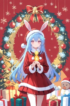 christmas,transparent,Torino,Goth_scenario,Melting,lightshadow,Girl as Santa,Christmas decor,Blue hair,Red outfit,Joyful look,Bottom left,Holiday items,Presents,Ornaments,Pinecones,Warm atmosphere,Inviting scene,Girl as Santa,Christmas decor,surrounded gifts,festive scene,bells stars snowflakes,gifts ornaments,bunny ear accessory,long dark hair,Santa hat,vibrant red green,Christmas decorations,Santa outfit,