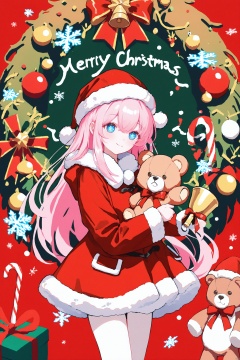 hewu,line,YHM,lengyu,christmas,pink hair,festive red coat,white fur trim,holding bell,holding teddy bear,teddy in outfit,holiday elements,candy canes,snowflakes,cheerful atmosphere,pink-haired girl,dressed Santa,holding bell,Christmas Day,hugging bear,pink hair,holding bell,holiday decorations,teddy bear,festive red coat,white fur trim,matching outfit,