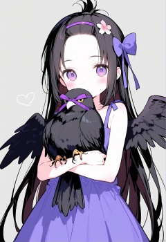High Elite loli 1girl long hair solo bangs pinned back black hair black wings dress happy birthday wings purple eyes purple dress looking at viewer covered mouth hair ornament feathered wings hair bow bow very long hair forehead covering own mouth ribbon purple ribbon hair flower flower grey background purple bow hugging tail hands up bird wings hair ribbon english text upper body animal holding blue ribbon entangled simple background sleeveless dress bird cowboy shot string,