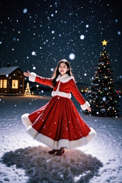 A stunning Asian girl in a festive Christmas dress, twirling amidst the snowflakes, set against a charming backdrop of a small wooden cottage, a towering Christmas tree, and colorful bubbles floating gently into the air. The soft glow of twinkling lights casts a warm ambiance, as she spins with joy, her bright smile radiating amidst the winter wonderland.