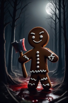 Dark fairy tales,A gingerbread man wielding an axe in a forest at night,with blood splatters and moonlight casting eerie shadows.,