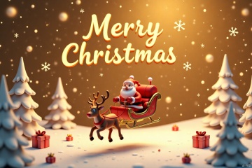 From a top-down vantage point, a whimsical Christmas scene unfolds in 3D OC rendering. In the air, Santa Claus guides his reindeer-powered carriage through a surreal landscape. The 3D cartoon-style illustration is set against a dark gold background with a small gift box nearby. Snowflakes gently float amidst the golden sky, reading 'Merry Christmas' in bold letters.